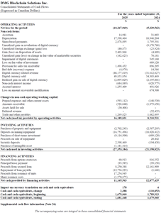 Forward-looking statements consist of statements that are not purely historical, including any statements regarding beliefs, plans, expectations, or intentions regarding the future. Such information can generally be identified by the use of forwarding-looking wording such as "may", "expect", "estimate", "anticipate", "intend", "believe" and "continue" or the negative thereof or similar variations. The reader is cautioned that assumptions used in the preparation of any forward-looking information may prove to be incorrect. Events or circumstances may cause actual results to differ materially from those predicted, as a result of numerous known and unknown risks, uncertainties, and other factors, many of which are beyond the control of the Company, including but not limited to, market and other conditions, volatility in the trading price of the common shares of the Company, business, economic and capital market conditions; the ability to manage operating expenses, which may adversely affect the Company's financial condition; the ability to remain competitive as other better financed competitors develop and release competitive products; regulatory uncertainties; access to equipment; market conditions and the demand and pricing for products; the demand and pricing of bitcoin; security threats, including a loss/theft of DMG's bitcoin; DMG's relationships with its customers, distributors and business partners; the inability to add more power to DMG's facilities; DMG's ability to successfully define, design and release new products in a timely manner that meet customers' needs; the ability to attract, retain and motivate qualified personnel; competition in the industry; the impact of technology changes on the products and industry; failure to develop new and innovative products; the ability to successfully maintain and enforce our intellectual property rights and defend third-party claims of infringement of their intellectual property rights; the impact of intellectual property litigation that could materially and adversely affect the business; the ability to manage working capital; and the dependence on key personnel. DMG may not actually achieve its plans, projections, or expectations. Such statements and information are based on numerous assumptions regarding present and future business strategies and the environment in which the Company will operate in the future, including the demand for its products, the ability to successfully develop software, that there will be no regulation or law that will prevent the Company from operating its business, anticipated costs, the ability to secure sufficient capital to complete its business plans, the ability to achieve goals and the price of bitcoin. Given these risks, uncertainties, and assumptions, you should not place undue reliance on these forward-looking statements. The securities of DMG are considered highly speculative due to the nature of DMG's business. For further information concerning these and other risks and uncertainties, refer to the Company’s filings on www.sedarplus.ca. In addition, DMG’s past financial performance may not be a reliable indicator of future performance.