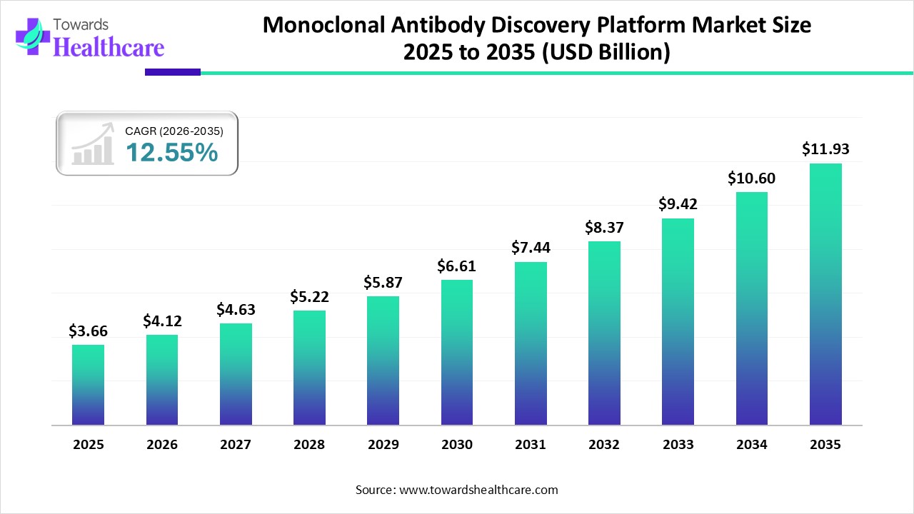 Ottawa, Dec. 18, 2025 (GLOBE NEWSWIRE) -- The global monoclonal antibody discovery platform market size is calculated at USD 4.12 billion in 2026 and is expected to reach around USD 11.93 billion by 2035, growing at a CAGR of 12.55% for the forecasted period. Market projects strong progression fueled by escalated investments, innovation, and increasing demand across diverse industries.